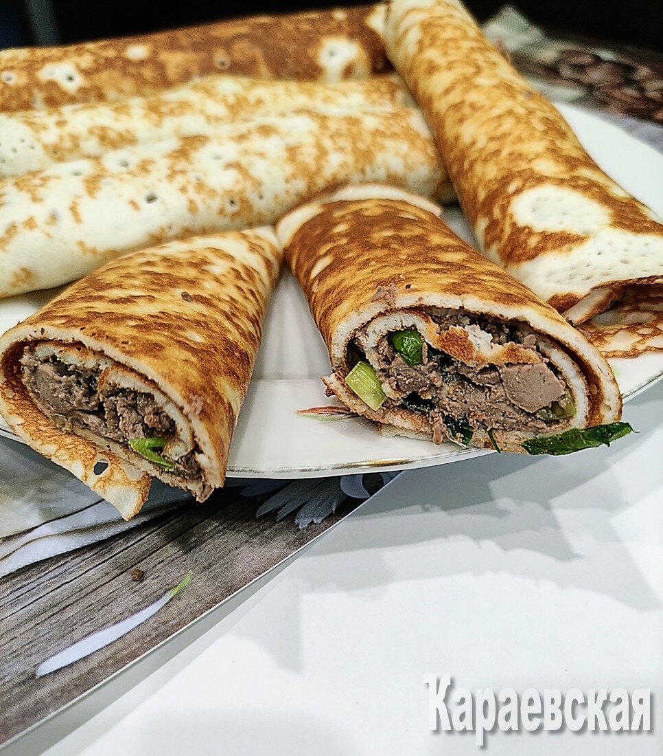 Для наполнения блинчиков куриную печень необходимо освободить от лишних пленок и довести до готовности. Лук нарезается мелко, солится и перемешивается для уменьшения объема. Готовую печень также нарезают, добавляют мягкое сливочное масло, нарезанный зеленый лук, а затем приправляют по вкусу. Начинка готова к использованию!