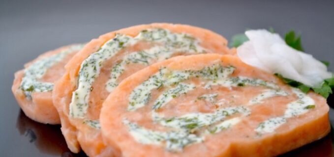 Сверните филе в рулет, начиная с хвоста. Закрепите его зубочистками и заверните в фольгу. Уберите в морозильник минимум на 2 часа, чтобы рулет хорошо застыл. После этого нарежьте его острым ножом на ломтики толщиной 1-1,5 см.