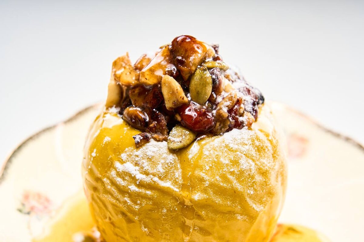 6. Перед подачей полить яблоки медом и посыпать сахарной пудрой для создания изысканного финиша.