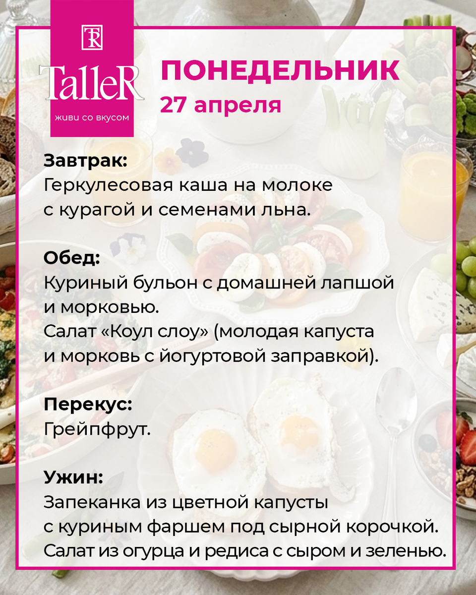 Мы подготовили для вас меню, которое не только порадует ваши вкусовые рецепторы, но и легко впишется в бюджет. На протяжении всей недели вас ждут яркие и простые блюда, способные удивить даже самых взыскательных гурманов.